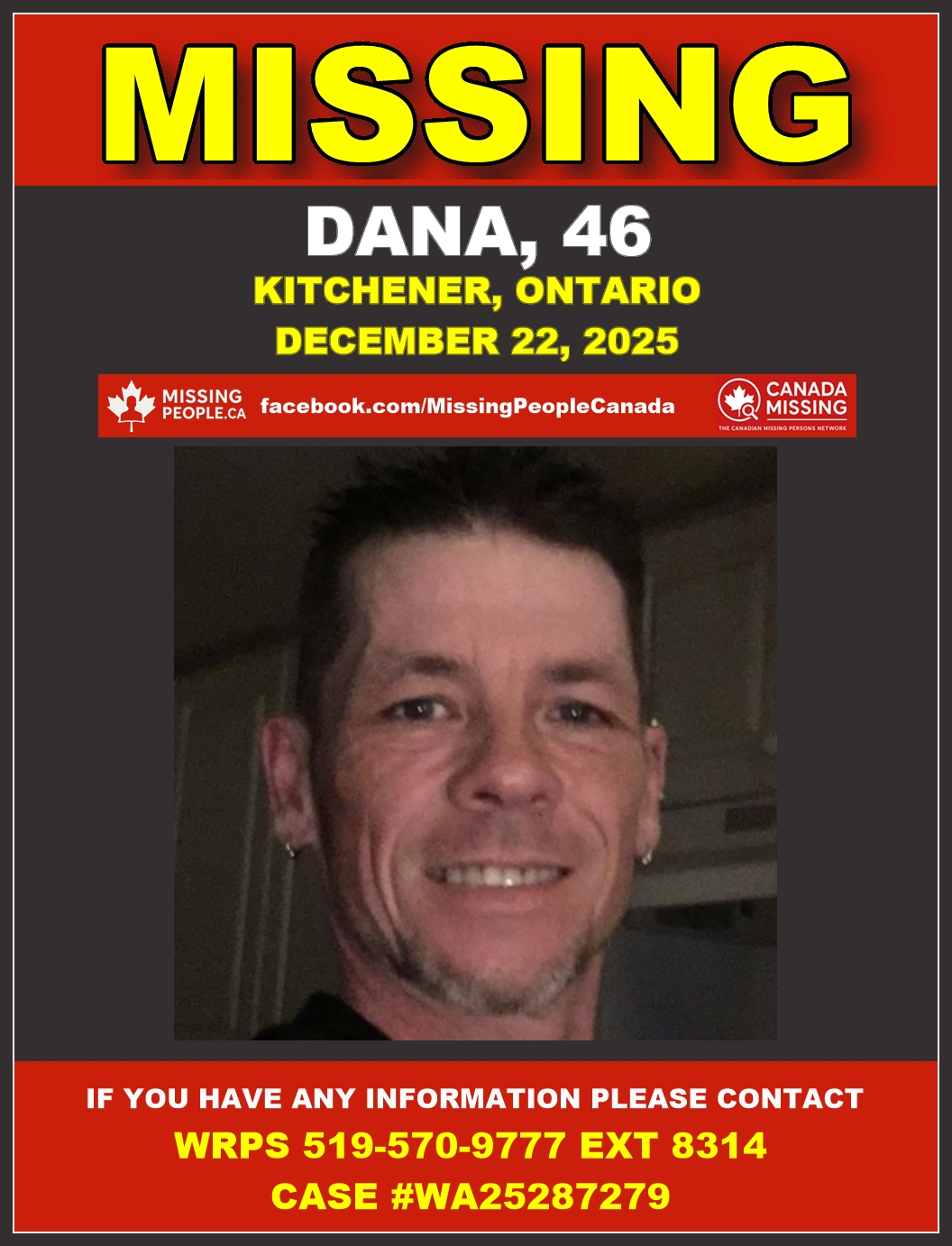 Dana, 46, from Kitchener, was last seen on December 22, 2025, in the Hayward Avenue and Lennox Lewis Way area. Police are concerned for his safety.