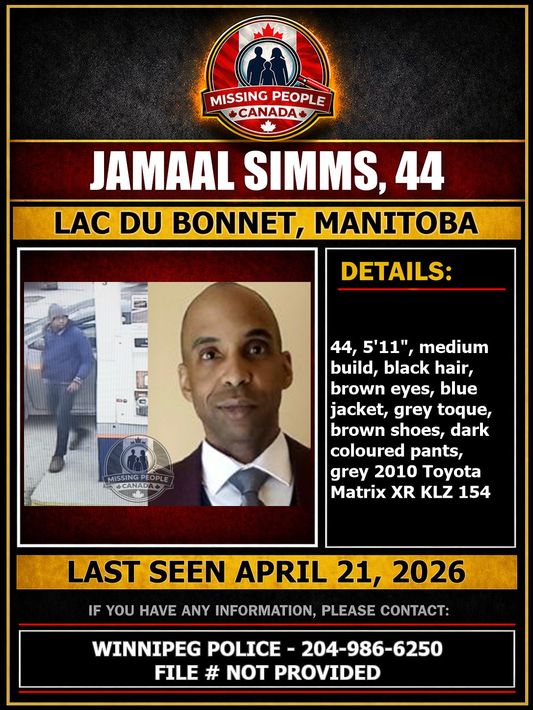 MISSING MAN IN LAC DU BONNET, MANITOBA – JAMAAL SIMMS, 44 – LAST SEEN APRIL 21, 2026