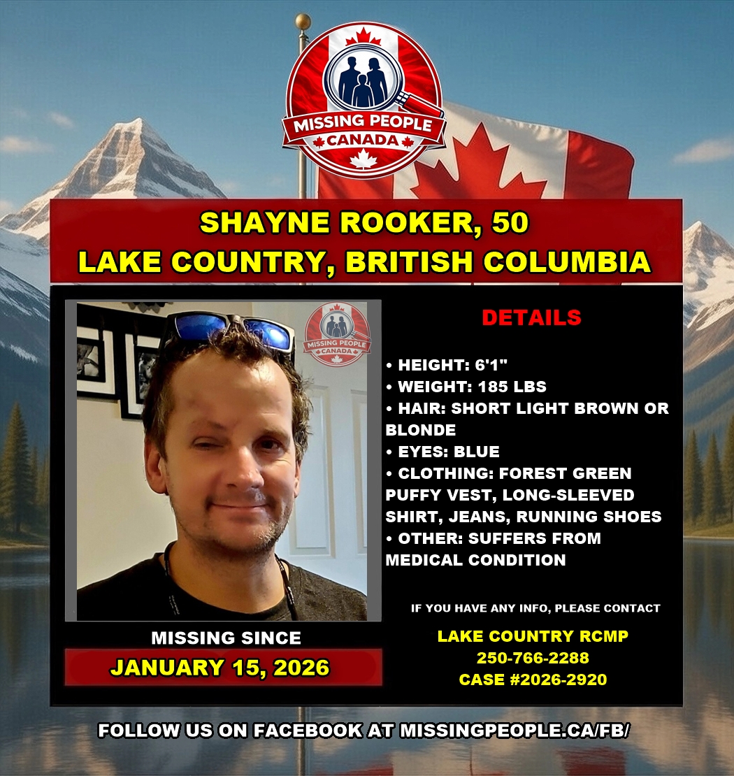 The Lake Country RCMP is asking for the public’s assistance in locating a missing 50-year-old man, Shayne Rooker. Shayne was last seen on January 15, 2026, in Lake Country. He is known to spend time around Harvey Avenue and Cooper Road in Kelowna. Police are concerned for his health and wellbeing as he suffers from a medical condition.