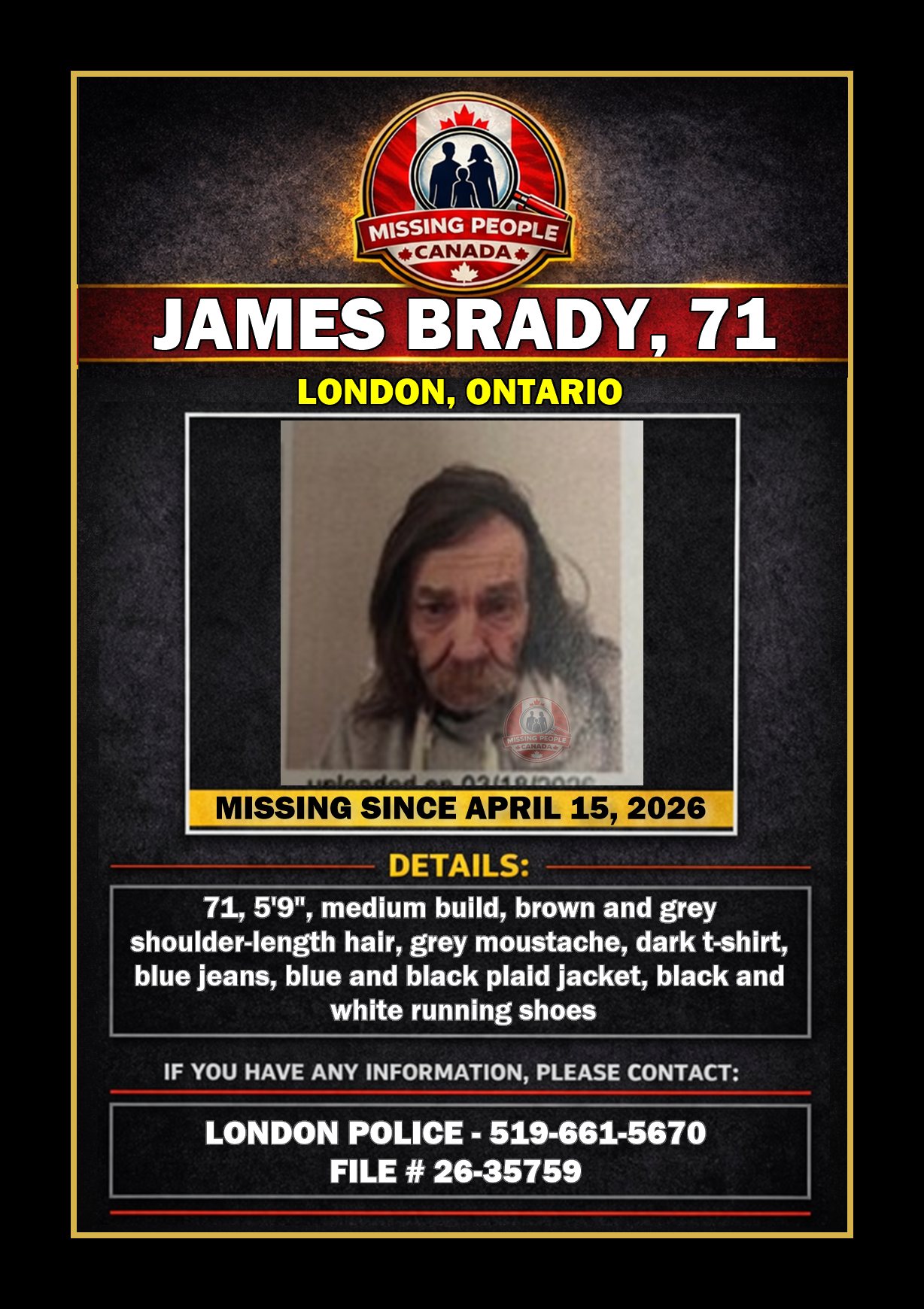 🚨 MISSING MAN IN LONDON, ONTARIO – JAMES BRADY, 71 – LAST SEEN APRIL 15, 2026