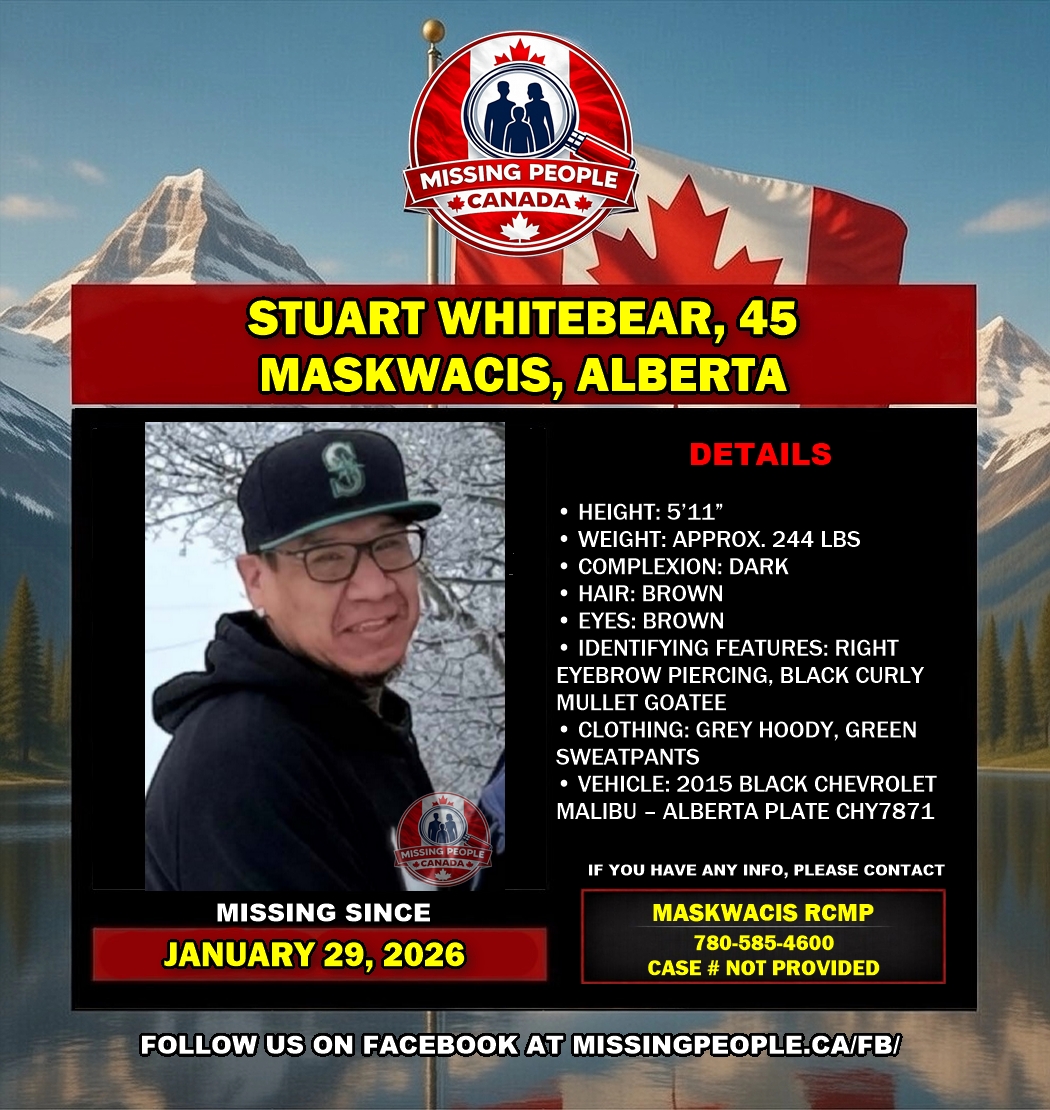 Anyone with information on Stuart’s whereabouts is asked to contact Maskwacis RCMP at 780-585-4600.