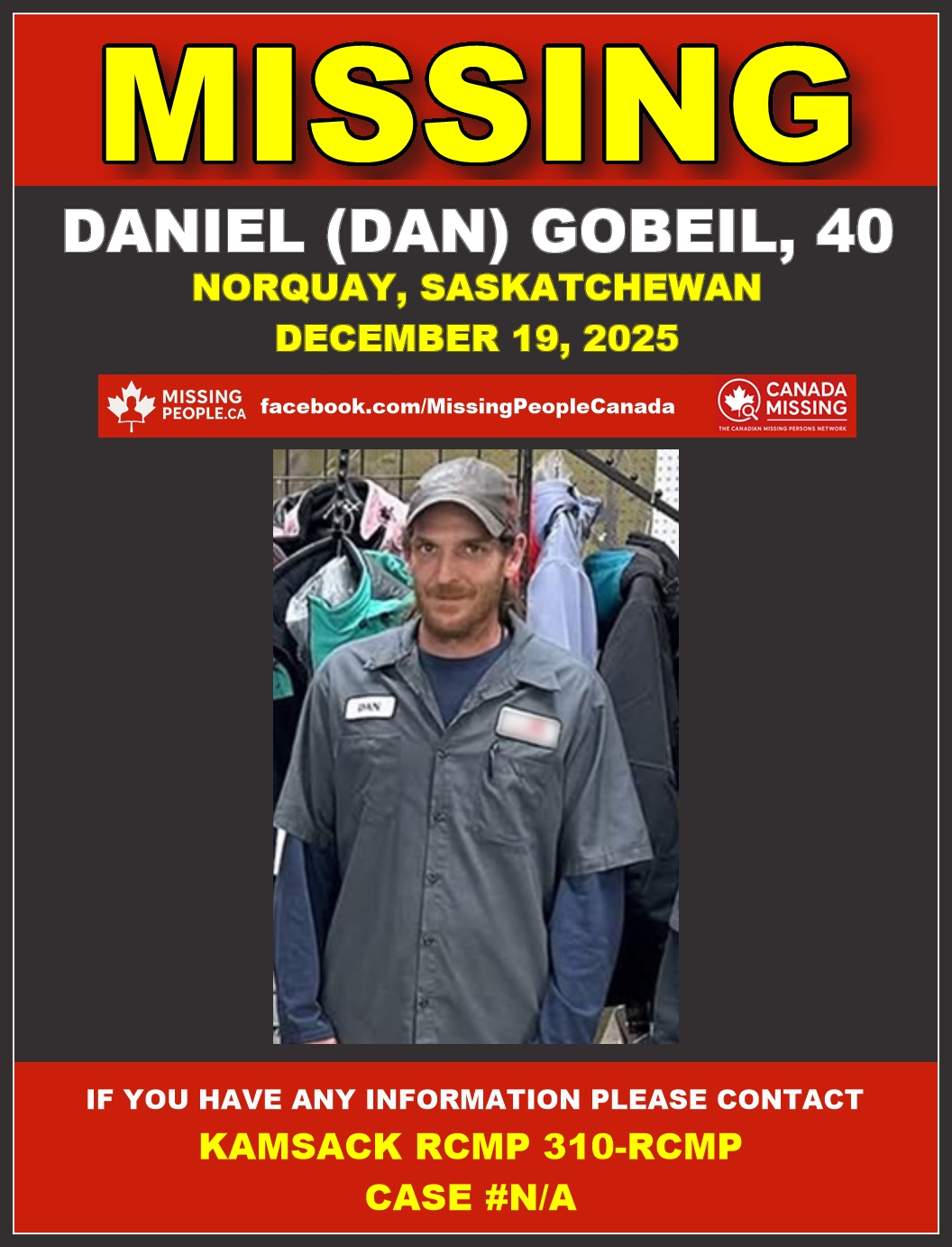 Daniel last spoke with someone shortly before 7:00 p.m. on December 19, 2025. His vehicle was later found stuck in a ditch and abandoned on a grid road near Norquay, SK (not stuck at the time of last contact). He is believed to be on foot. Due to cold temperatures, RCMP and family are very concerned for his safety. Property owners in the area are asked to check farm outbuildings or sheds.