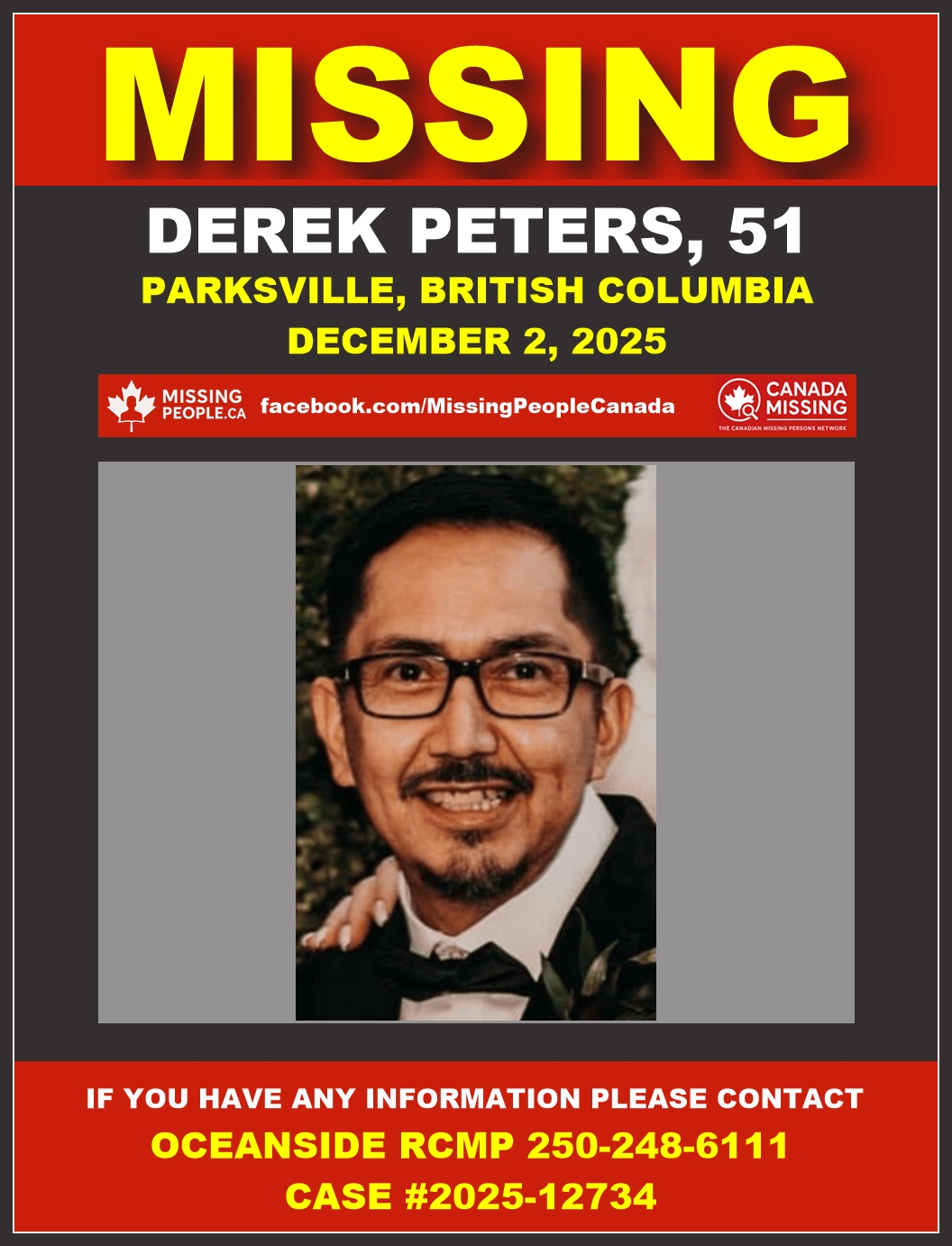 The Oceanside RCMP is requesting the public’s assistance in locating Derek Peters, a 51-year-old male from Parksville. File #2025-12734.