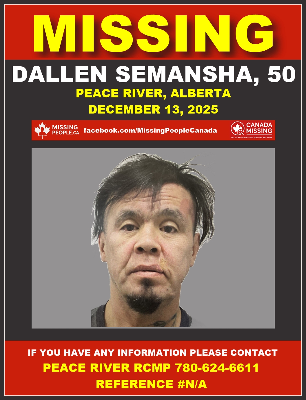 The Peace River RCMP is asking for the public’s help in locating Dallen Semansha, a 50-year-old male from Chateh (last seen in Peace River).