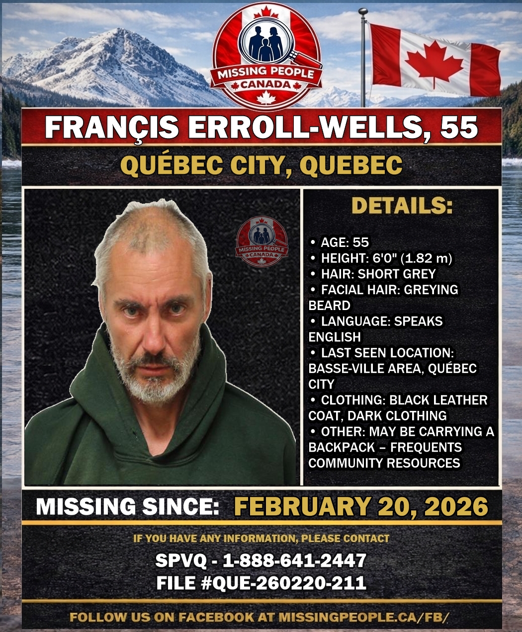 The Québec City Police Service (SPVQ) is asking for the public’s and media’s help to locate a missing 55-year-old man, Françis Erroll-Wells. He was last seen on February 20, 2026 in the Basse-Ville sector. He travels on foot and may frequent community resources. Police and family are concerned for his health and safety if he is not located quickly.