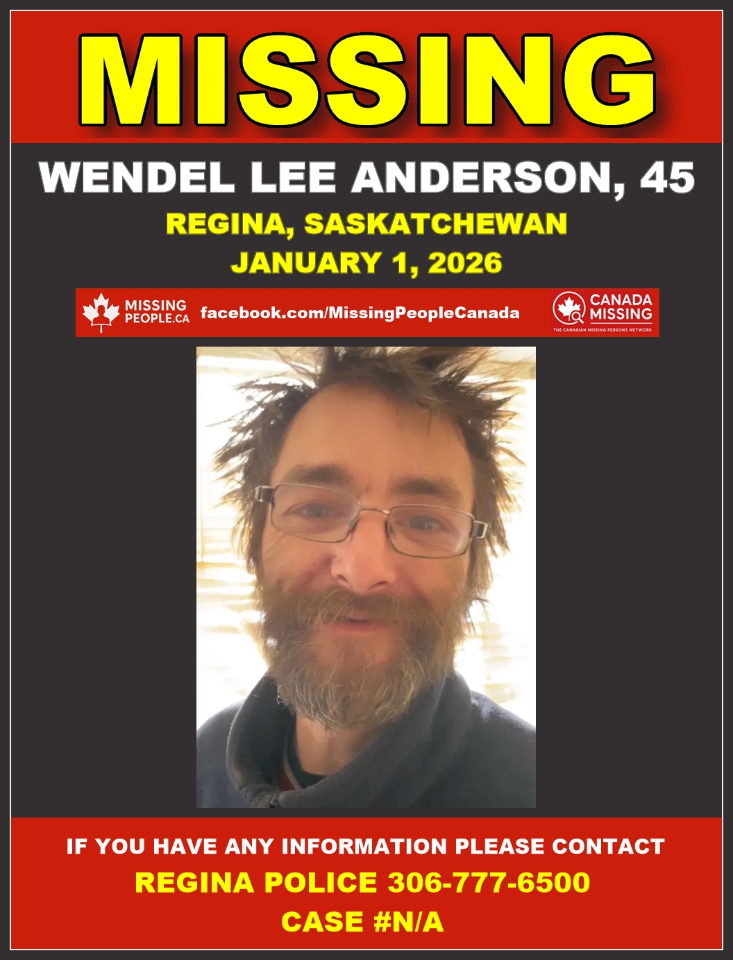 The Regina Police Service is asking for information from the public that could assist in locating a missing 45-year-old man, Wendel Lee Anderson. Anderson was last seen on January 1, 2026, at approximately 9:00 a.m. in the 800 Block of Winnipeg Street near Ross Avenue. There is no evidence to believe Anderson has come to harm, however, he is considered at risk due to a medical condition and the fact he was not dressed for the current weather conditions. Police would like to locate him to ensure his safety.