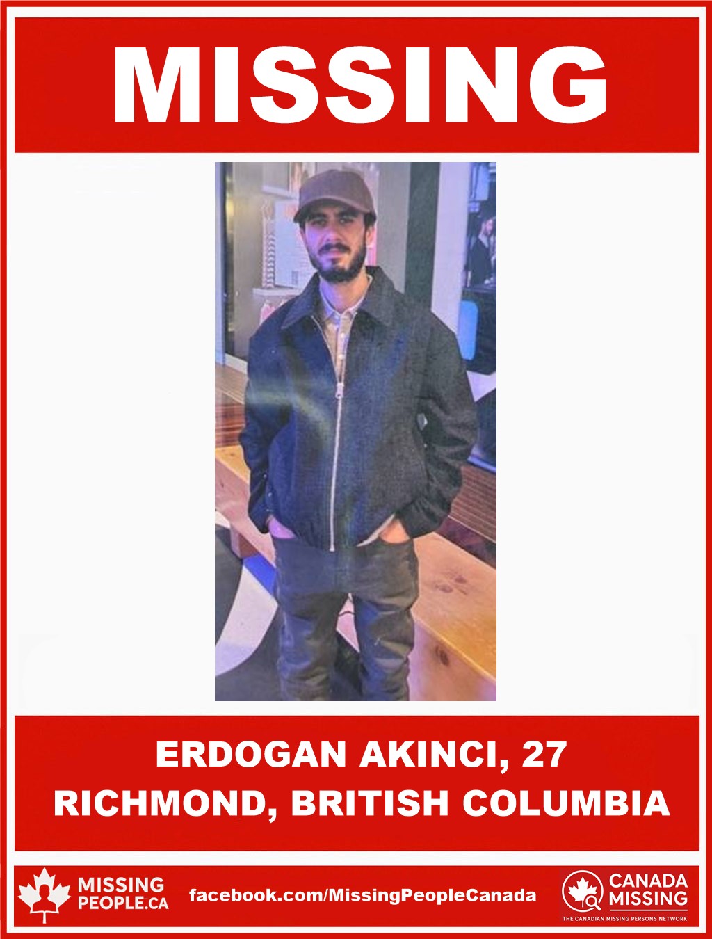 The Richmond RCMP is seeking the public’s assistance in locating 27-year-old Erdogan Akinci, who was reported missing on October 29, 2025.