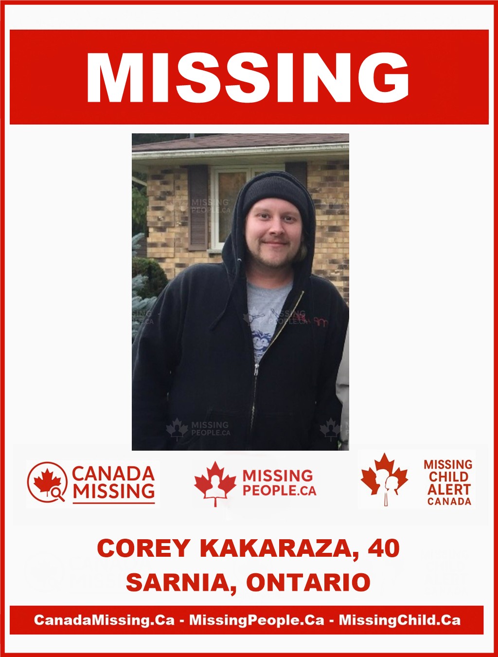 The Sarnia Police Service is requesting the public’s assistance in locating Corey Kakaraza, a 40-year-old man missing from the Queen Street and Devine Street area.