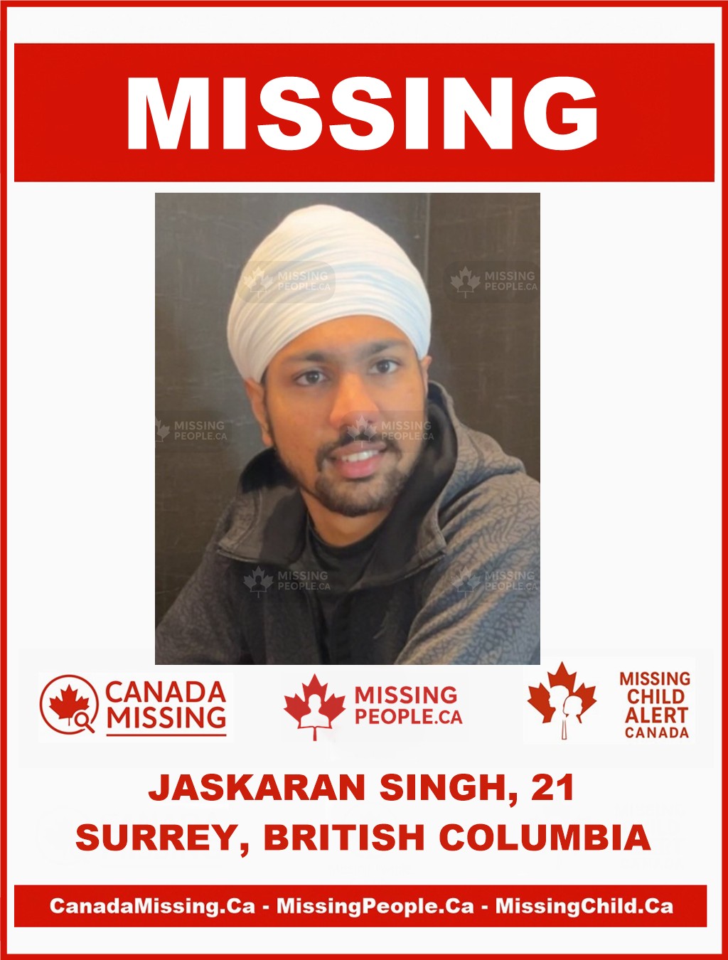 The Surrey Police Service (SPS) and the RCMP Surrey Provincial Operations Support Unit (SPOSU) are requesting the public’s assistance in locating 21-year-old Jaskaran Singh, who has been reported missing from Surrey, British Columbia.