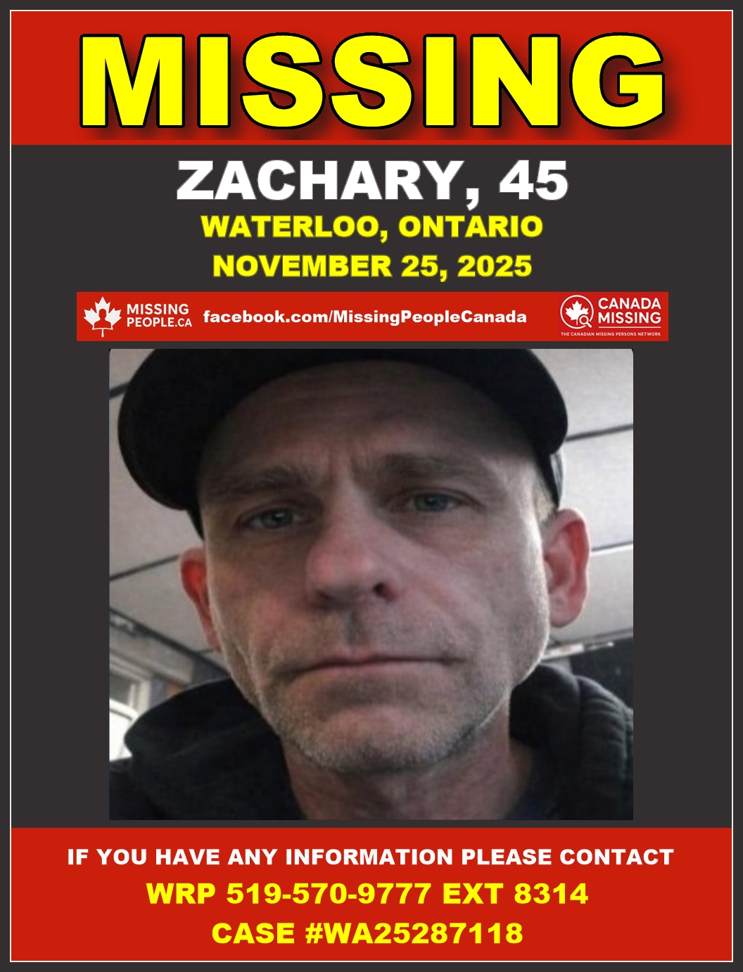 The Waterloo Regional Police are requesting the public’s assistance in locating a missing 45-year-old man, Zachary. Zachary was last seen on November 25, 2025, in the area of University Avenue West in Waterloo. There is a concern for his wellbeing.