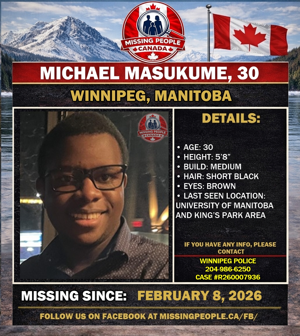 The Winnipeg Police Service Missing Persons Unit is requesting the public’s assistance in locating a missing 30-year-old man, Michael Masukume. Michael was last seen in the morning of Sunday, February 8, 2026, in the area of University of Manitoba and King’s Park. Police are concerned for his well-being.