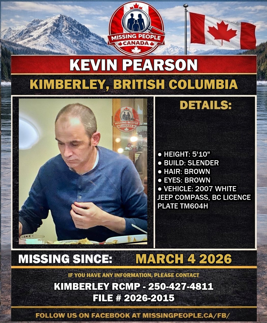 The Kimberley RCMP is requesting the public’s assistance locating Kevin Pearson, who was last seen leaving his home in Kimberley, British Columbia at 6:30 p.m. on Wednesday, March 4, 2026. Kevin is believed to be driving a 2007 white Jeep Compass with BC licence plate TM604H. Police are concerned for his safety.