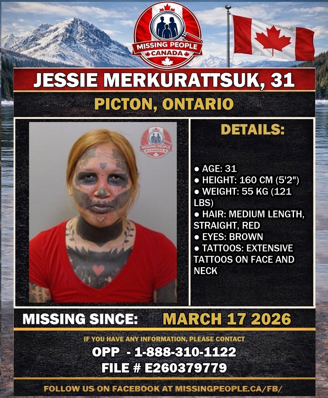 The ONTARIO PROVINCIAL POLICE is requesting the public’s assistance locating Jessie Merkurattsuk, 31. She was last seen on Tuesday, March 17, 2026 in Picton, Ontario. Police are concerned for her safety.