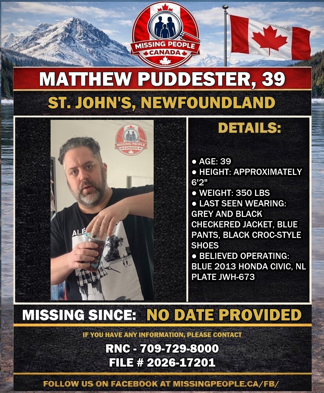 The Royal Newfoundland Constabulary (RNC) is requesting the public’s assistance locating Matthew Puddester, 39, of St. John’s, Newfoundland. He is described as male, approximately 6’2″ tall, 350 lbs. He was last seen wearing a grey and black checkered jacket, blue pants, and black Croc-style shoes. He is believed to be operating a blue 2013 Honda Civic with Newfoundland and Labrador licence plate JWH-673. Police are concerned for his safety.