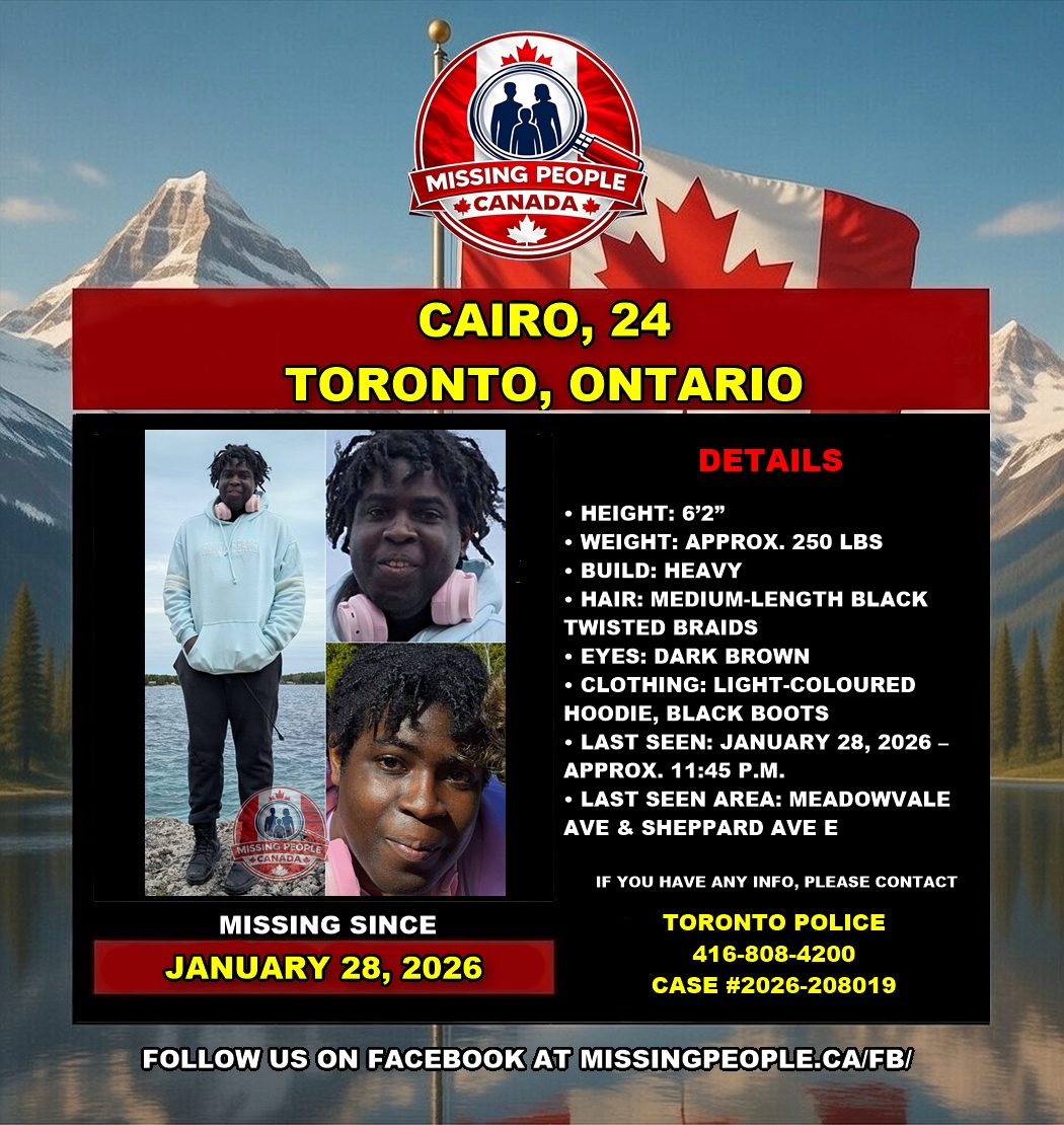 Cairo was last seen on Wednesday, January 28, 2026, at approximately 11:45 p.m., in the area of Meadowvale Avenue and Sheppard Avenue East.