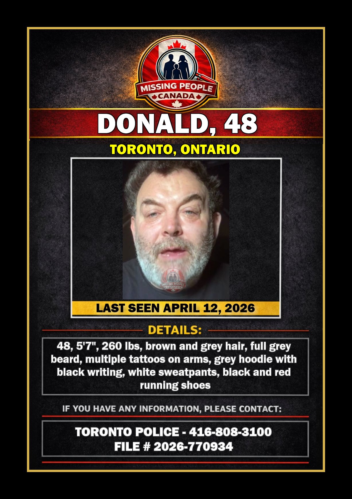🚨 MISSING PERSON IN TORONTO, ONTARIO – DONALD, 48 – LAST SEEN APRIL 12, 2026