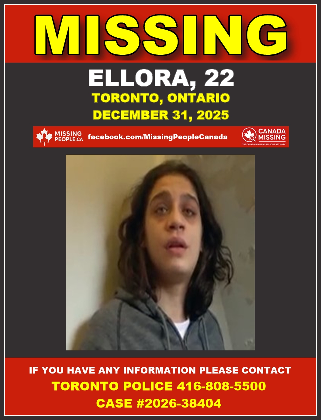 The Toronto Police Service is requesting the public’s assistance locating a missing person, Ellora, 22. Ellora was last seen on Wednesday, December 31, 2025, at 11:50 a.m., in the Danforth Avenue and Greenwood Avenue area. Police are concerned for their safety.