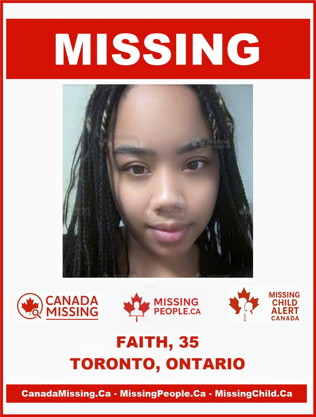 The Toronto Police Service is requesting the public’s assistance locating a missing person, Faith, 35.