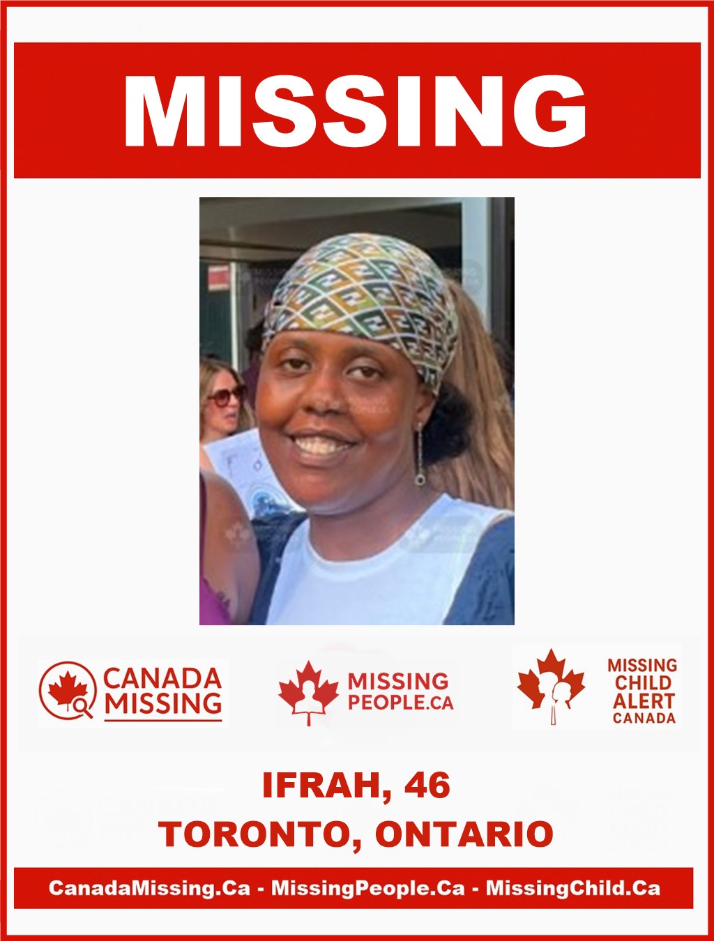 Ifrah, 46, was last seen on Friday, August 22, 2025, in the area of Islington Avenue and Kingsview Boulevard in Toronto, Ontario.