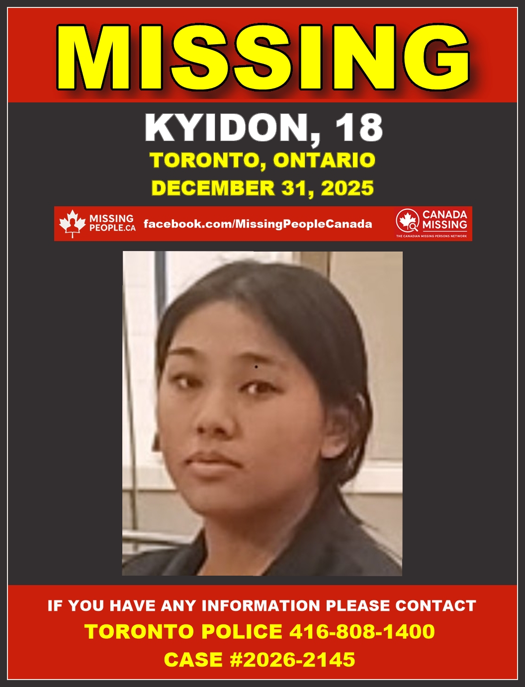 The Toronto Police Service is requesting the public’s assistance locating a missing person, Kyidon, 18. Kyidon was last seen on Wednesday, December 31, 2025, at approximately 7 p.m., in the King Street West and Jameson Avenue area. Police are concerned for their safety.