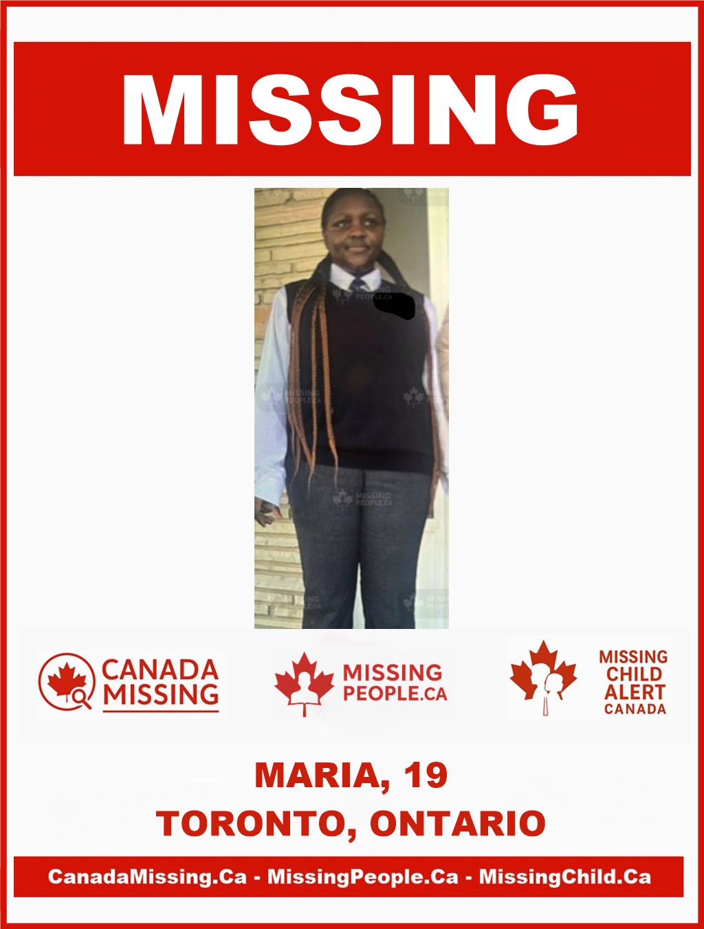 The Toronto Police Service is requesting the public’s assistance in locating Maria, 19.
