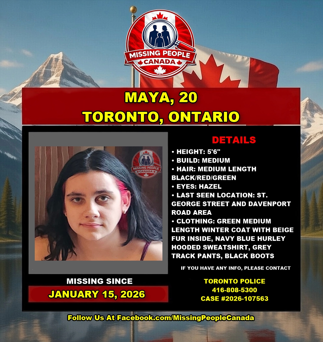 The Toronto Police Service is requesting the public’s assistance locating a missing person, Maya, 20. Maya was last seen on Thursday, January 15, 2026, at 8:50 a.m., in the St. George Street and Davenport Road area. Police are concerned for their safety.