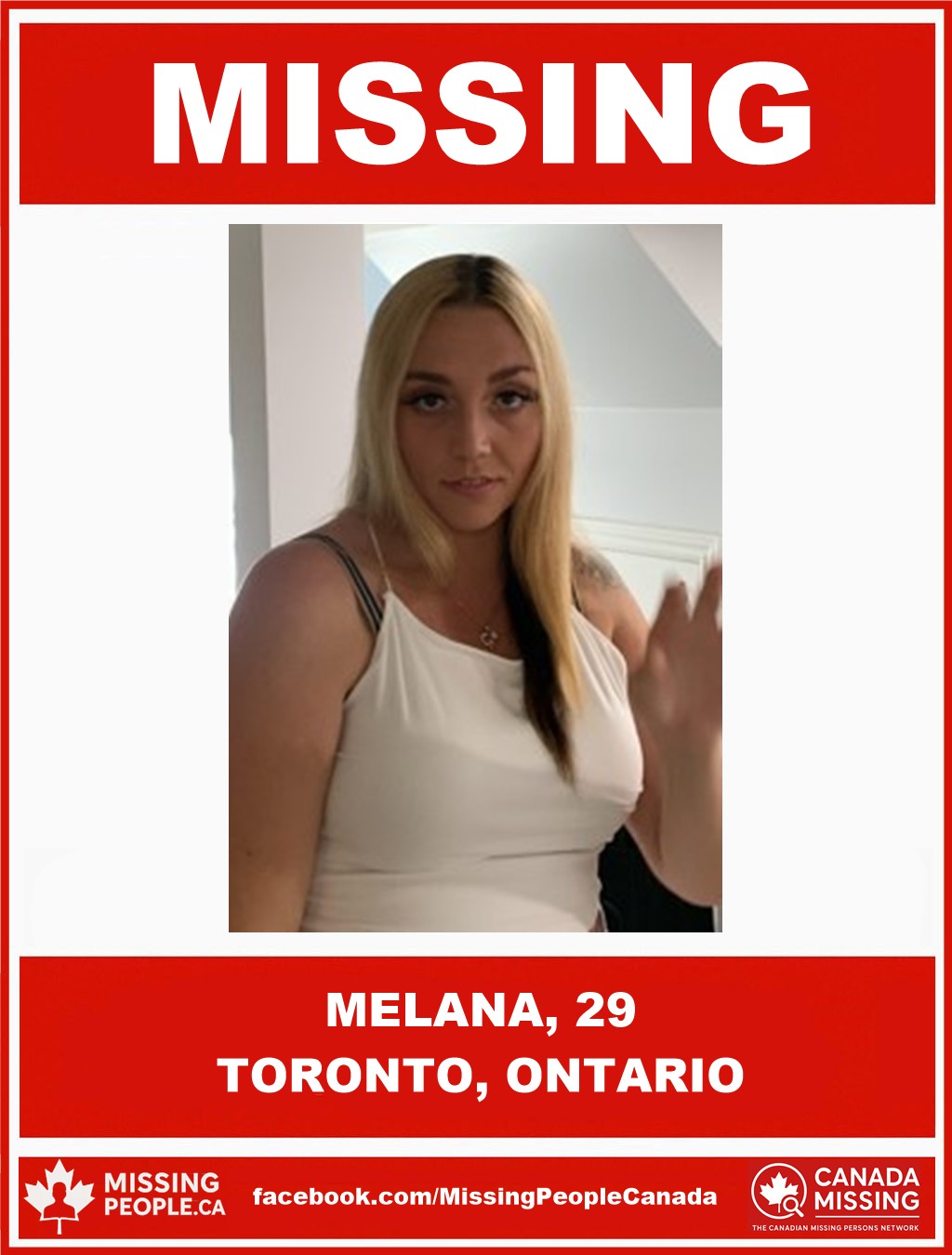If you have any information regarding Melana’s location, please contact the Toronto Police Service at 416-808-2300 or Crime Stoppers anonymously at 416-222-TIPS (8477), or visit www.222tips.com.