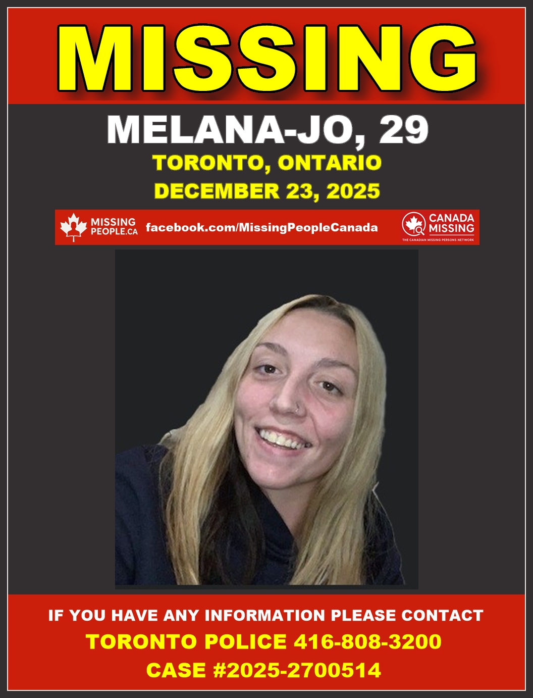 The Toronto Police Service is requesting the public’s assistance locating a missing person, Melana-Jo, 29. Melana-Jo was last seen on Tuesday, December 23, 2025, at approximately 11 p.m., in the Finch Avenue East and Willowdale Avenue area. Police are concerned for their safety.