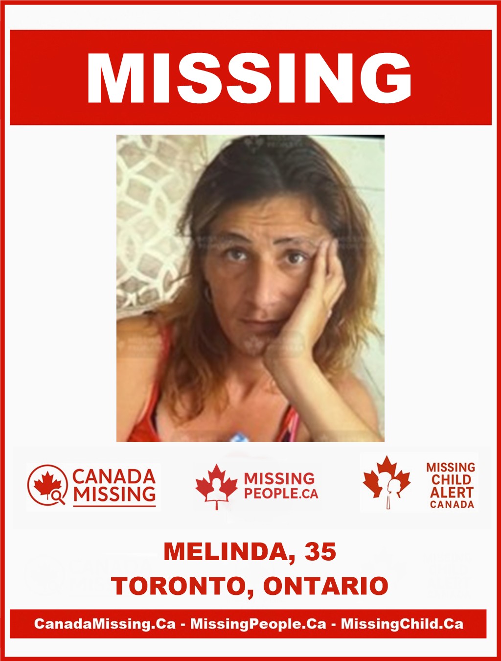 Anyone with information about Melinda’s whereabouts is asked to contact the Toronto Police Service at 416-808-1300.