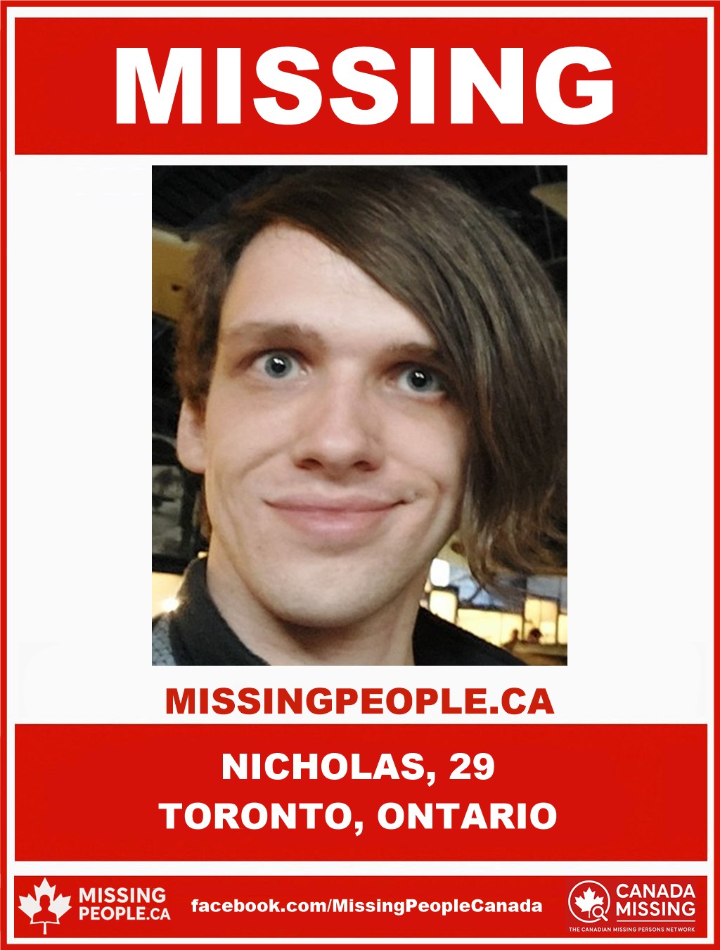 The Toronto Police Service is requesting the public’s assistance in locating Nicholas, a 29-year-old missing person from Toronto.