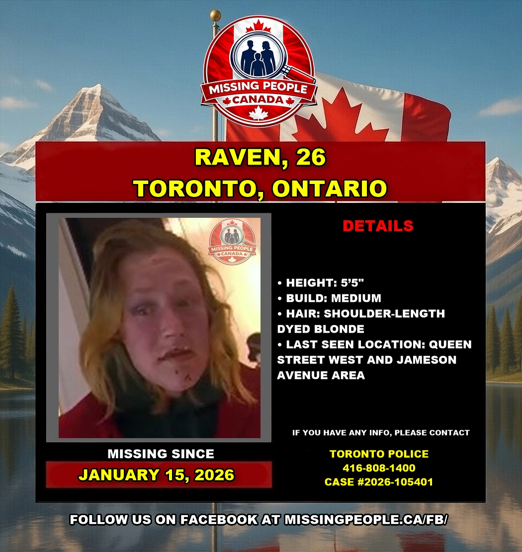 The Toronto Police Service is requesting the public’s assistance locating a missing person, Raven, 26. Raven was last seen on Thursday, January 15, 2026, at 10:15 a.m., in the Queen Street West and Jameson Avenue area. Police are concerned for their safety.