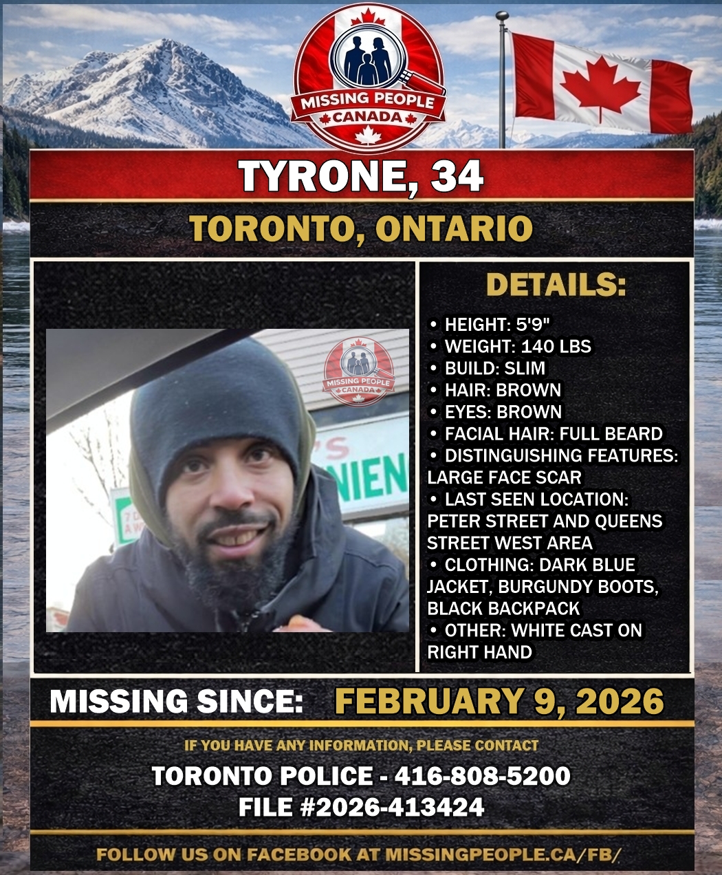 🚨 Missing person in Toronto, Ontario – Tyrone, 34 – Last Seen February 9 2026