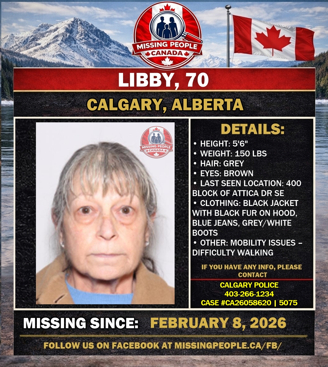 The Calgary Police Service is requesting the public’s assistance in locating a missing 70-year-old senior, Libby. Libby was last seen on foot on February 8, 2026, at approximately 2:40 p.m., in the 400 block of Attica Dr SE. Police are concerned for her welfare.