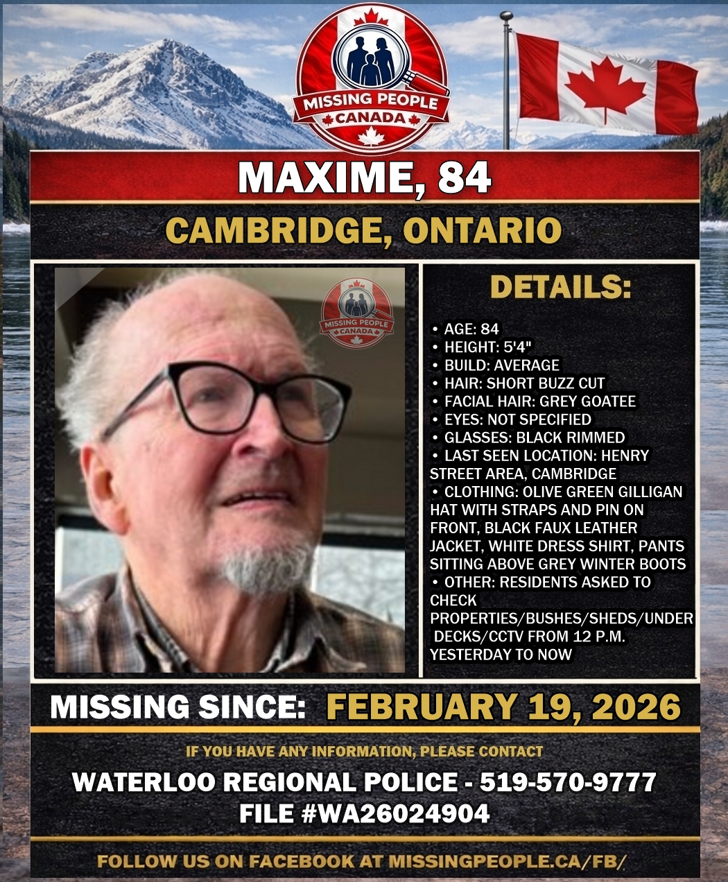 The Waterloo Regional Police Service is asking for the public’s assistance in locating a missing 84-year-old senior, Maxime. Maxime was last seen February 19, 2026 in the area of Henry Street in the City of Cambridge. There is concern for Maxime’s well-being.