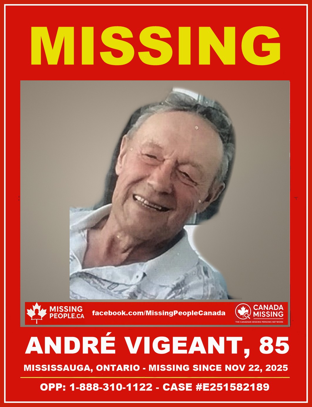 Missing Senior in Cornwall, Ontario – André Vigeant, 85 – Last Seen November 22, 2025