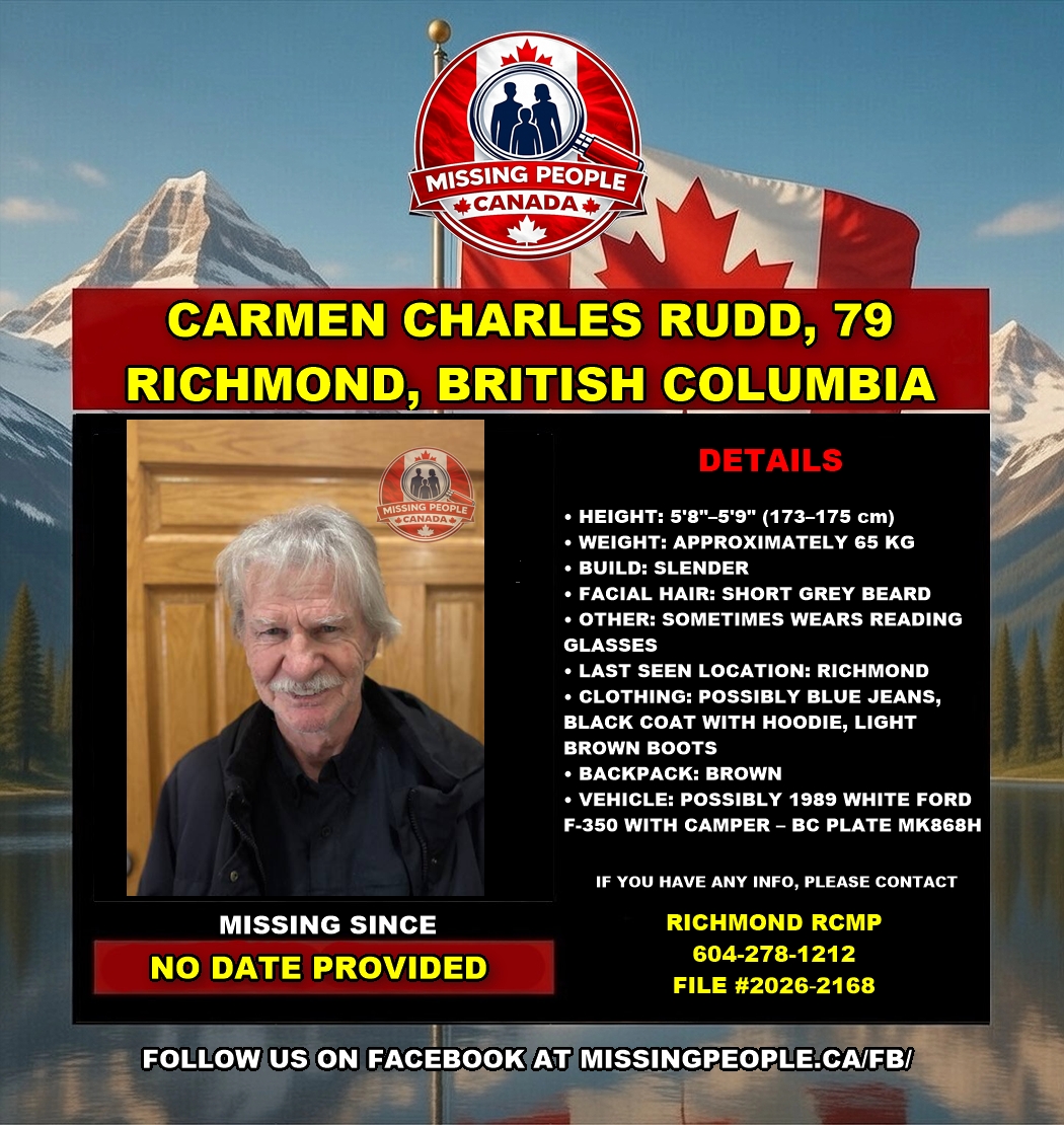 Anyone with information regarding Carmen Charles Rudd’s whereabouts is asked to contact the Richmond RCMP at 604-278-1212 (File #2026-2168).