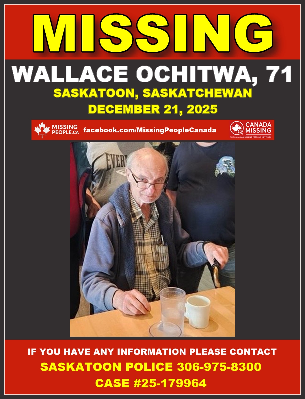 The Saskatoon Police Service is requesting public assistance in locating Wallace Ochitwa, a 71-year-old male from Saskatoon. Occurrence #25-179964.