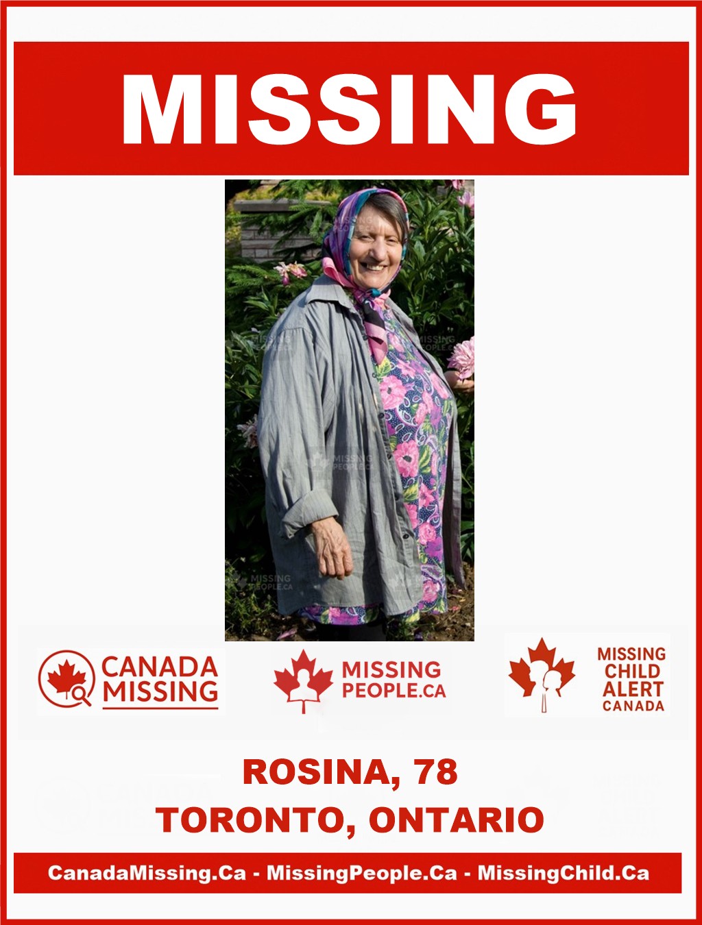 The Toronto Police Service is requesting the public’s assistance in locating Rosina, 78, who has been reported missing from Toronto, Ontario.