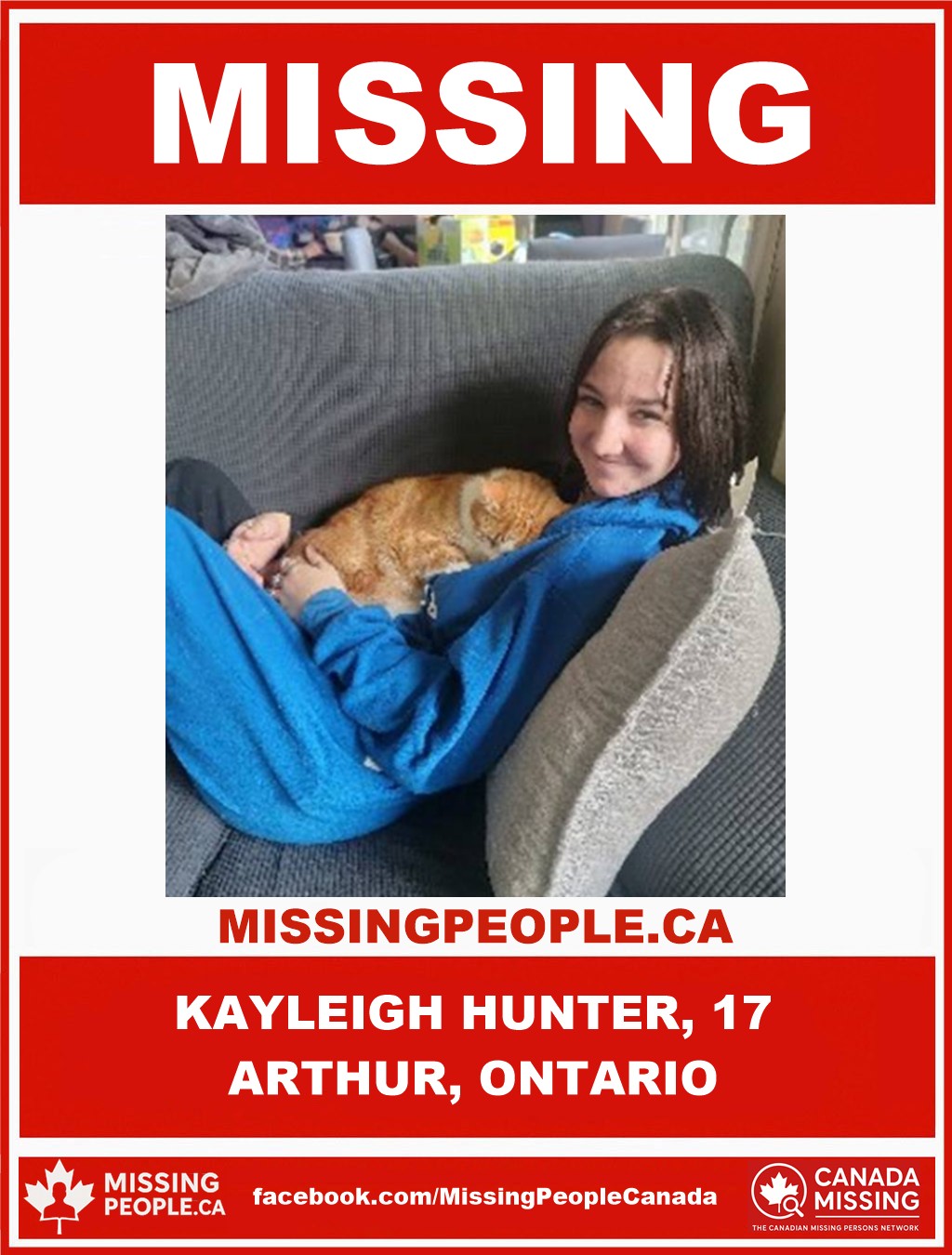 KAYLEIGH was last seen on Wednesday, November 12, 2025, around 5:00 p.m. on Tucker Street in Arthur, Ontario. She was wearing burgundy boots, a purple hoodie with black and white writing, and blue jeans.