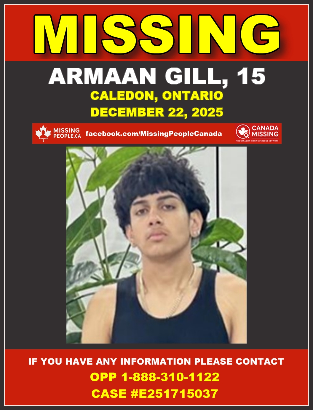The Caledon OPP is seeking the public’s assistance in locating Armaan Gill, a 15-year-old male. Ref# E251715037.