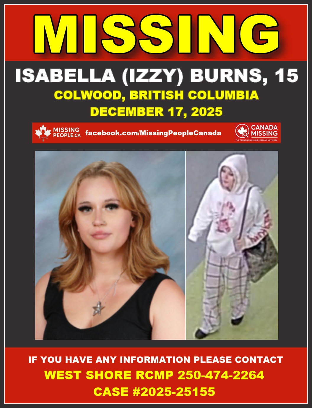 The West Shore RCMP is seeking public assistance in locating Isabella (Izzy) Burns, a 15-year-old Caucasian female. File #2025-25155.