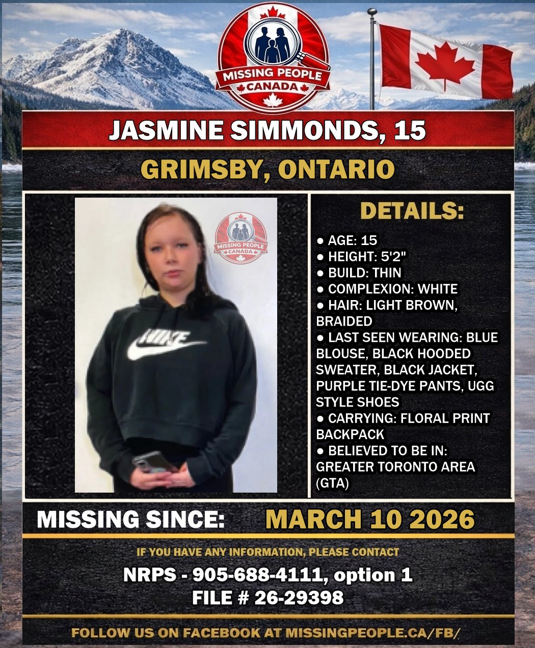 The Niagara Regional Police Service is requesting the public’s assistance locating missing teen Jasmine Simmonds, 15. She was last seen on Tuesday, March 10, 2026 at approximately 6:30 p.m. boarding a bus. Jasmine is believed to be in the Greater Toronto Area (GTA). Police are concerned for her welfare.