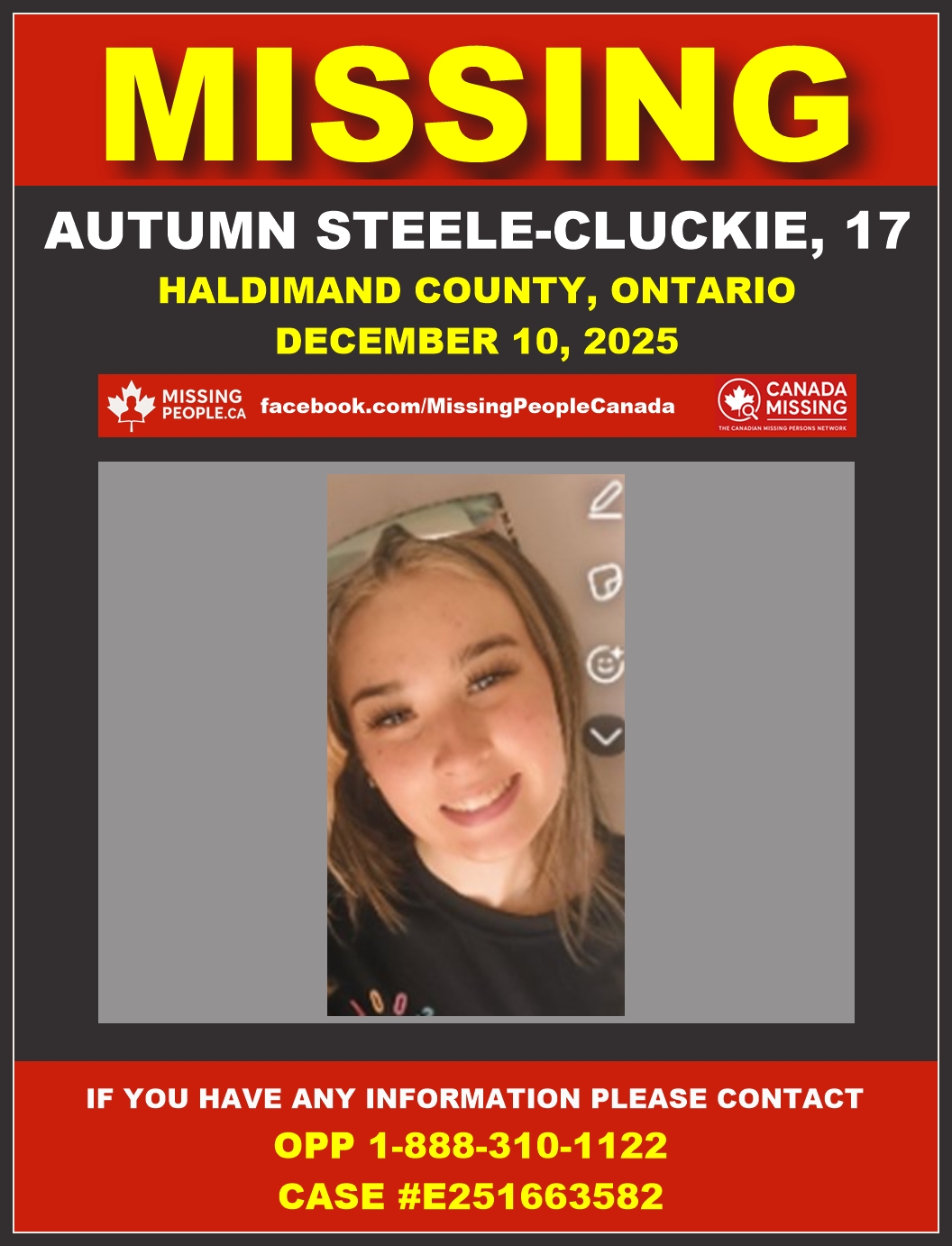 The Haldimand OPP is seeking assistance in locating Autumn Steele-Cluckie, a 17-year-old female from Haldimand County. Ref# E251663582.