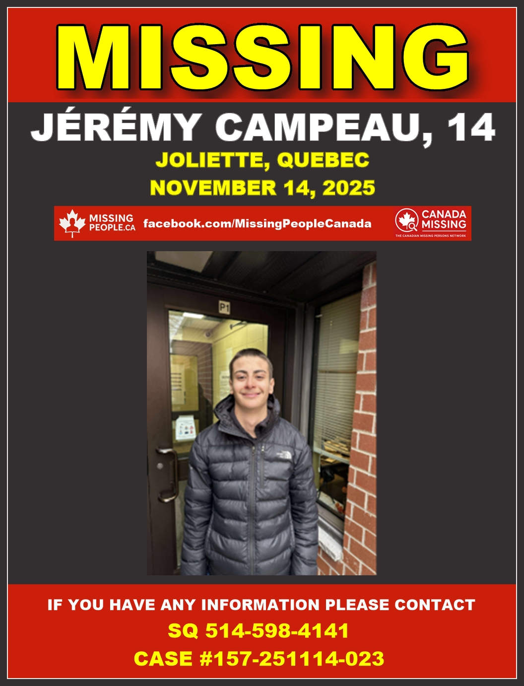 🚨 Missing Male Teen in Joliette, Quebec – Jérémy Campeau, 14 – Last Seen November 14 2025