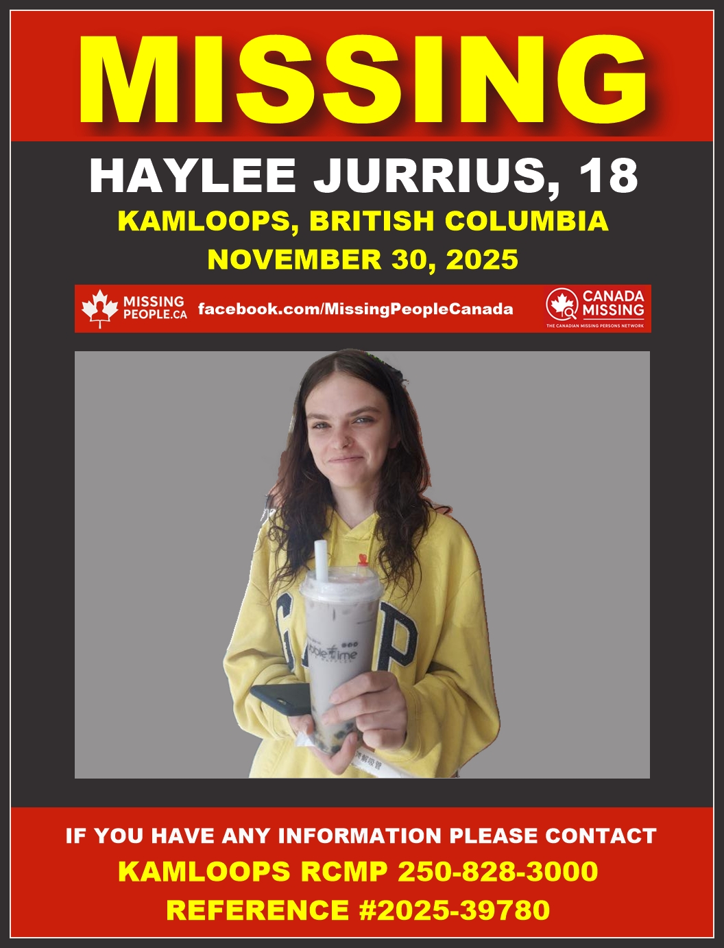 Le GRC de Kamloops demande l’aide du public pour retrouver Haylee Jurrius, une jeune femme de 18 ans de Kamloops. Dossier #2025-39780.