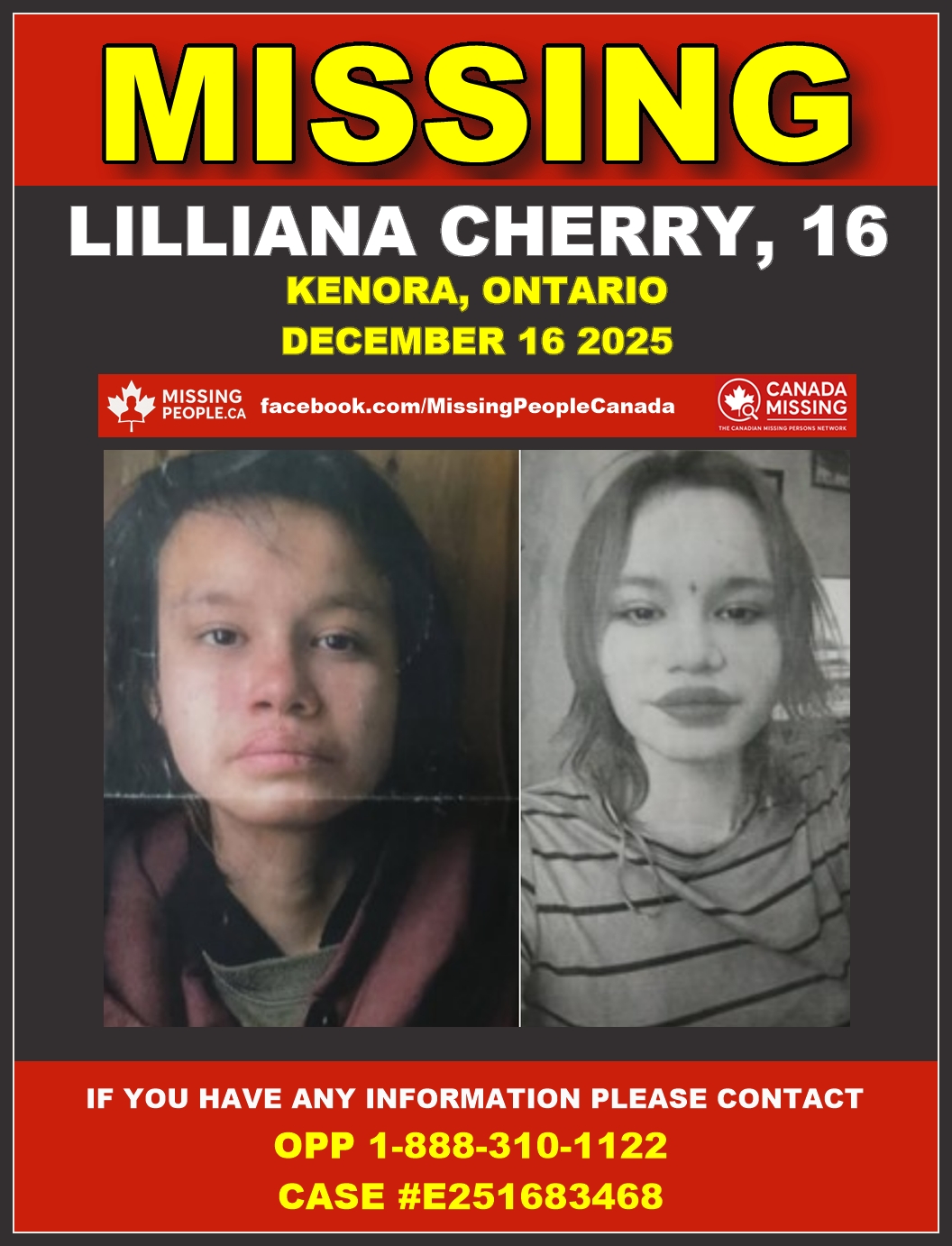 The Kenora OPP is attempting to locate Lilliana Cherry (also known as Elie), a 16-year-old female. Ref# E251683468.