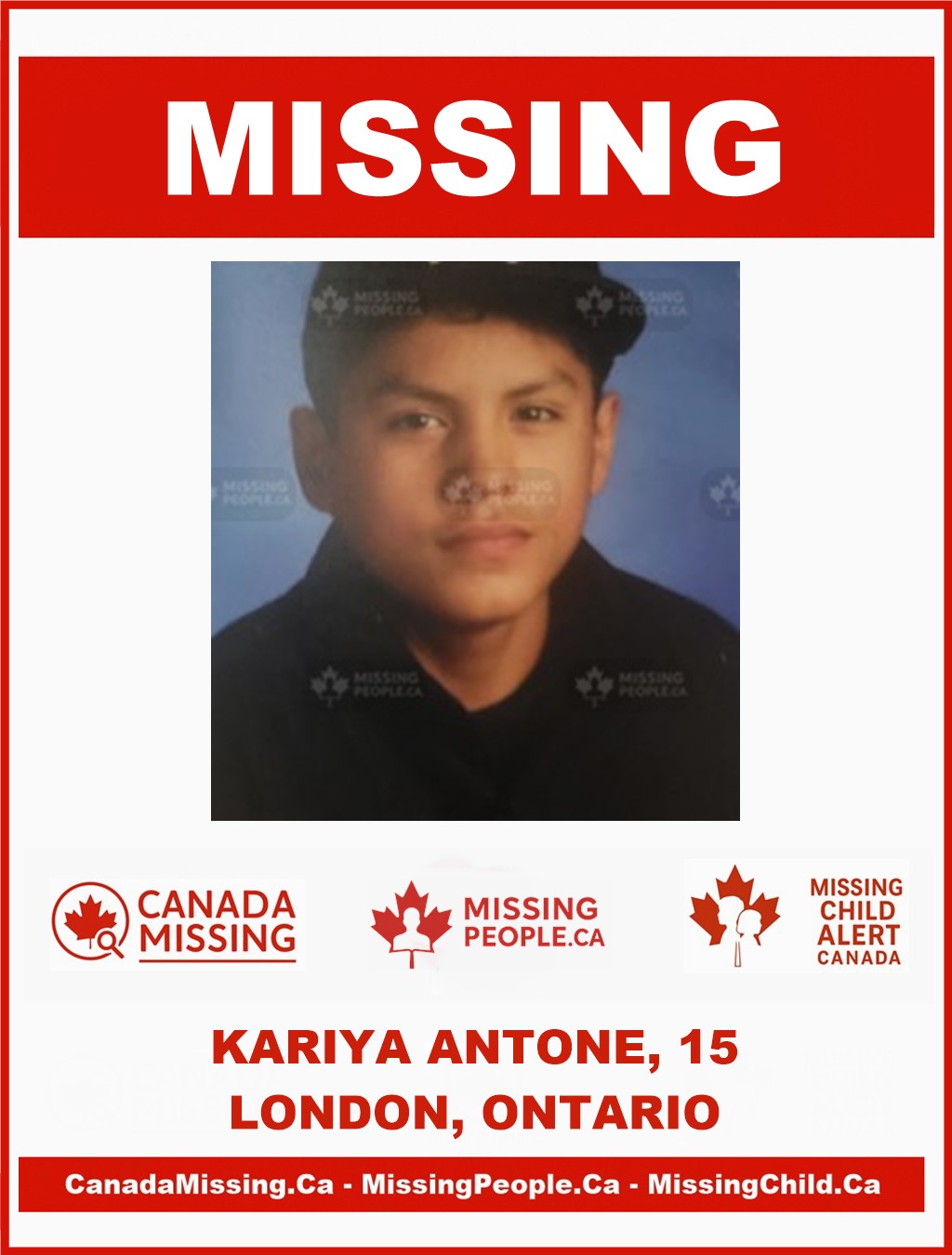 Kariya Antone, 15, of London, Ontario, was reported missing on September 28, 2025. He was last seen in the area of Wellington and Exeter roads.