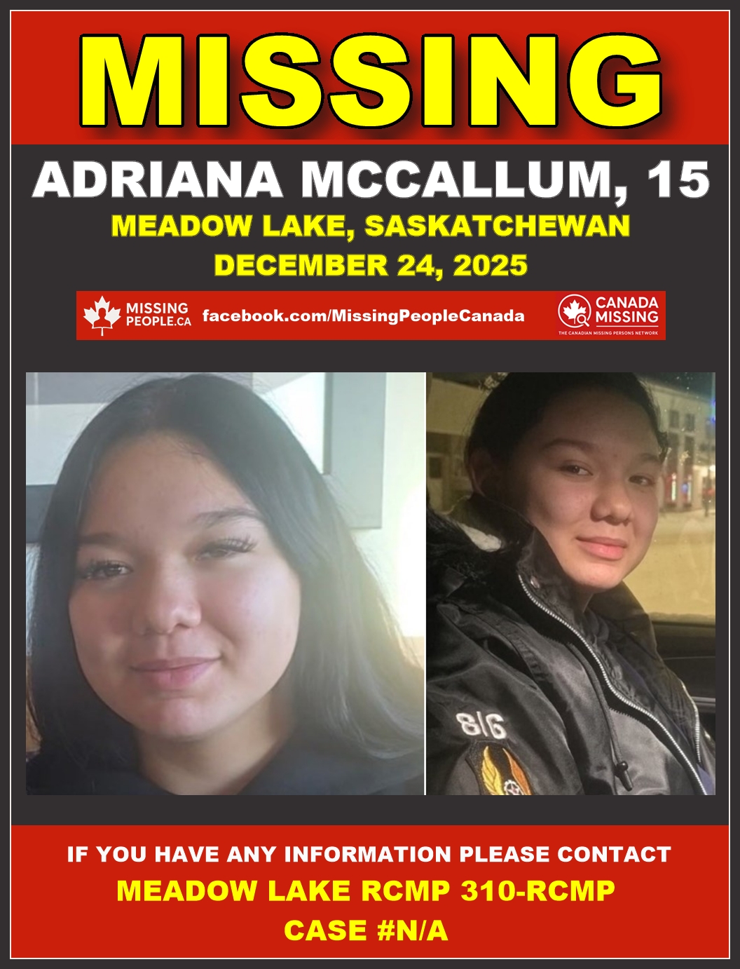 Police say Adriana McCallum, who also goes by the names Shalayne or AJ, was last seen on 1st Street East in Meadow Lake on December 24, 2025. Her current whereabouts are unknown. Police are continuing efforts to locate her and are asking the public to report any information that may help bring her home safely.