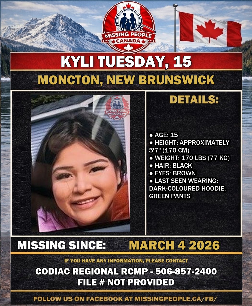 The Codiac Regional RCMP is requesting the public’s assistance locating missing teen Kyli Tuesday, 15, from Moncton, New Brunswick. She was last seen on Wednesday, March 4, 2026 at approximately 10:20 p.m. near Parkdale Street in Moncton. She was reported missing to police the same day. Police have followed up on several leads but have so far been unable to locate her. Police and her family are concerned for her well-being.