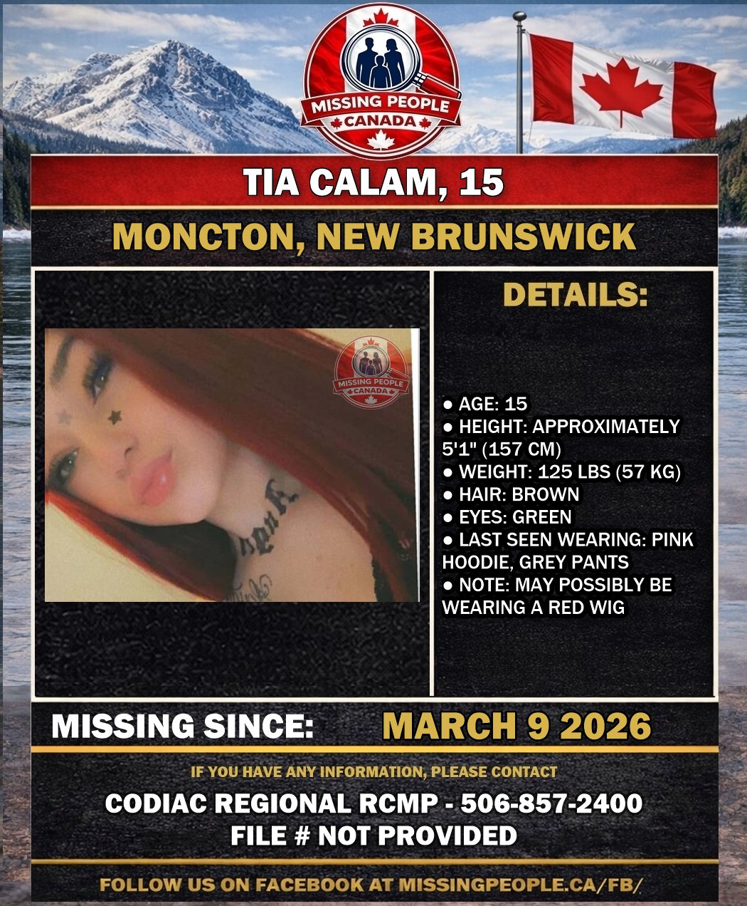 The Codiac Regional RCMP is requesting the public’s assistance locating missing teen Tia Calam, 15, from Moncton, New Brunswick. She was last seen on Monday, March 9, 2026 at approximately 5:19 p.m. near Tanya Crescent in Moncton. She was reported missing to police the same day. Police have followed up on several leads but have so far been unable to locate her. Police and her family are concerned for her well-being.